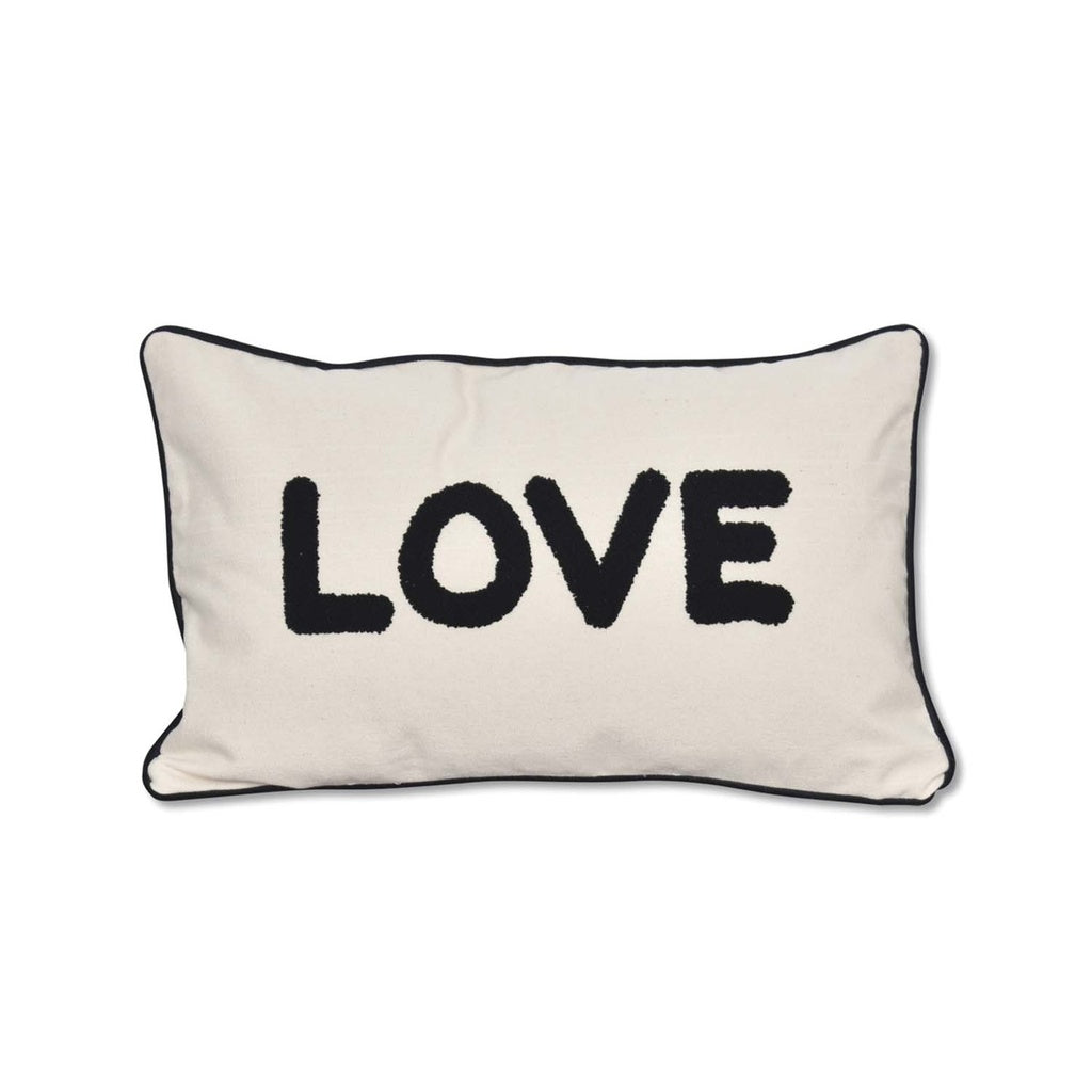 Un coussin en toile épaisse naturelle avec le mot love brodé bouclette en noir... Le message est passé. Le dos en toile uni naturelle. Une touche artistique alliant couleur et matière fera vibrer votre intérieur et complétera parfaitement votre décoration Vendu avec garnissage (100% polyester). Déhoussable