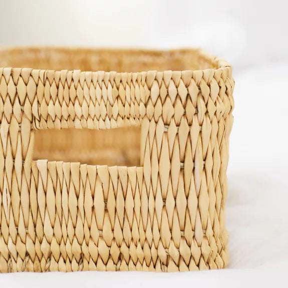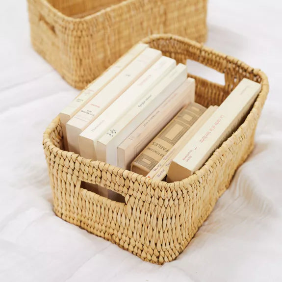 Caisse de rangement en paille avec ses deux poignées latérales. La fabrication Artisanale rend votre panier unique. Les dimensions et les couleurs peuvent légèrement varier d'une pièce à l'autre
