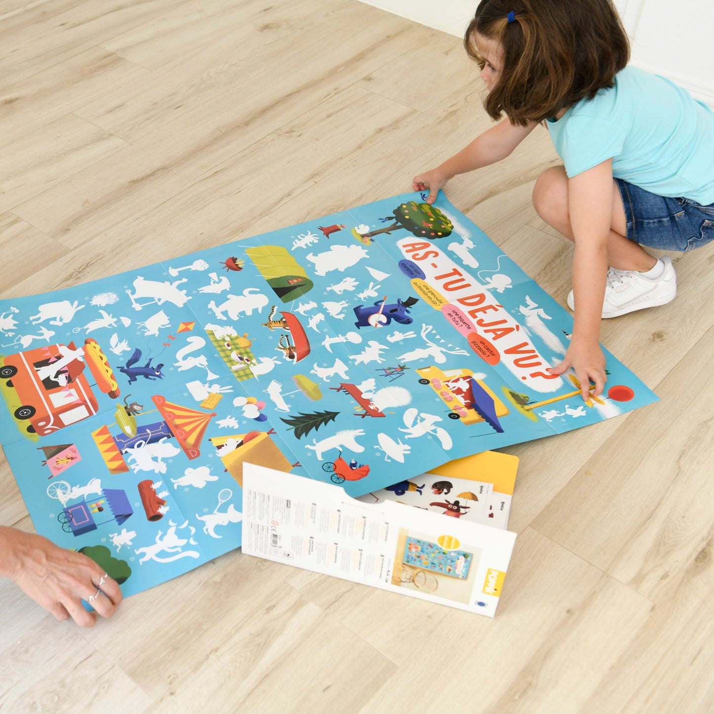 L’enfant colle plusieurs dizaines de grands stickers sur le poster sur les emplacements indiqués, en observant attentivement les silhouettes. Une fois l’affiche complétée, elle se transforme en jeu de “cherche et trouve” : on lit les devinettes et l’enfant s’amuse à retrouver l’animal sur son poster. Une manière ludique de décorer sa chambre !